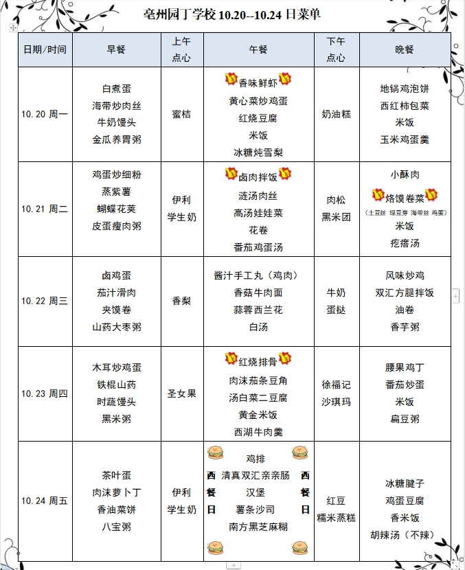亳州园丁学校10.20--10.24日菜单