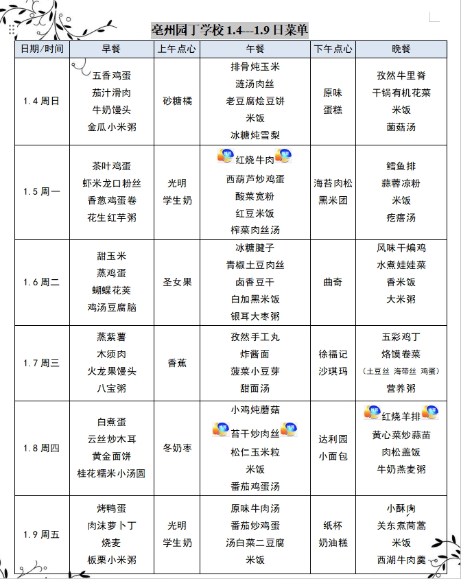亳州园丁学校1.4---1.9日菜单