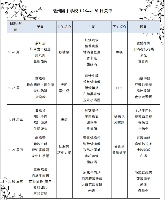 亳州园丁学校1.26---1.30日菜单