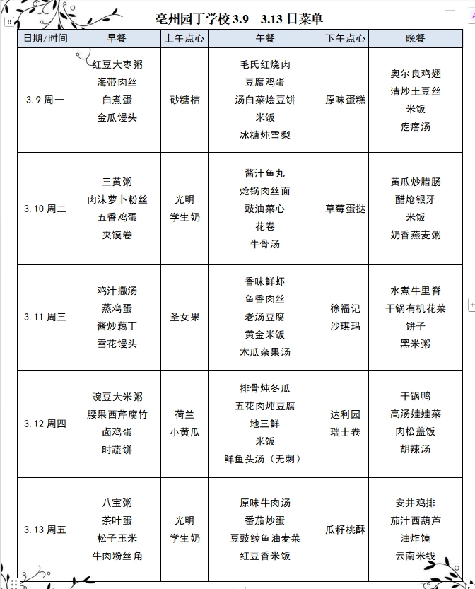 亳州园丁学校3.9---3.13日菜单